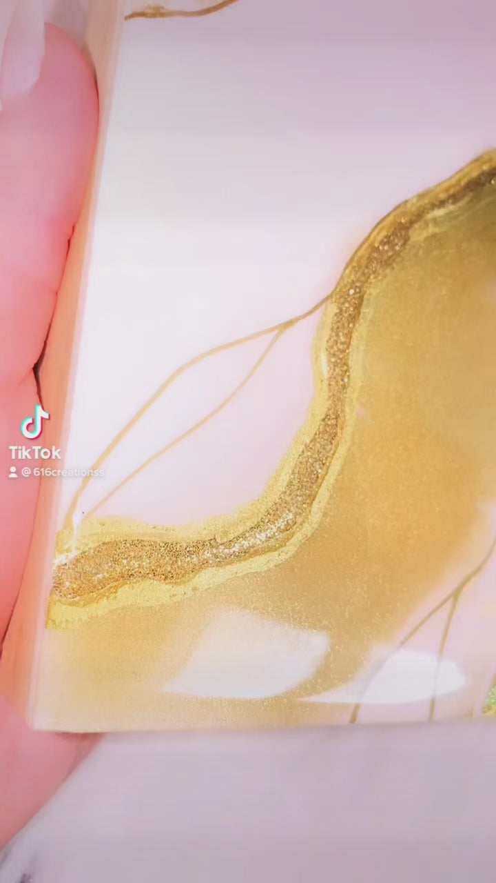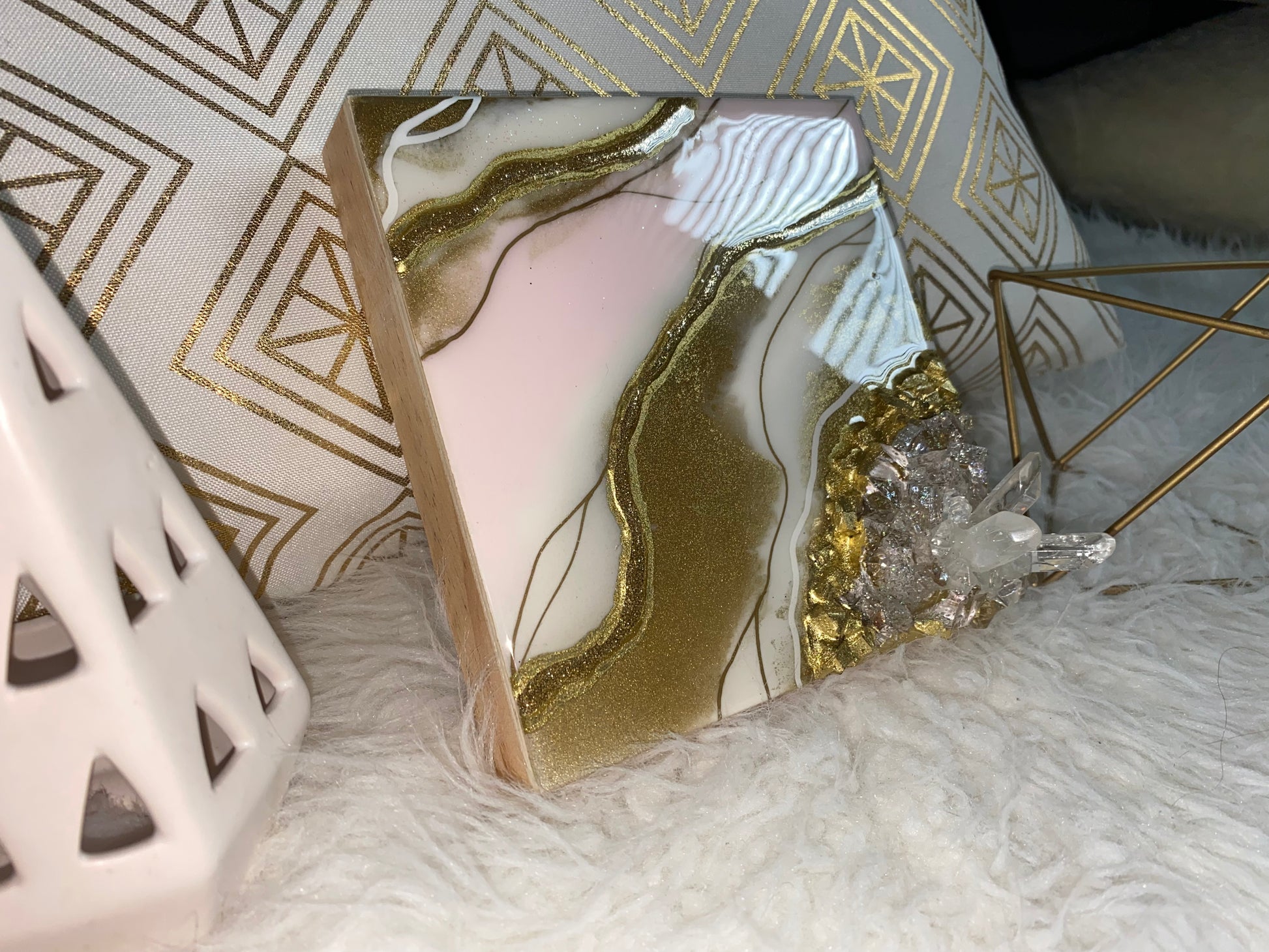 Pink and gold resin geode mini. Epoxy resin with crushed glass , glitter and glass crystal points. On previous wood canvas board. 6x6